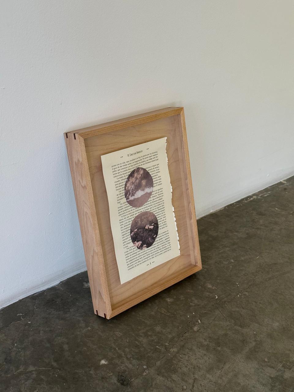 Collage, magazine cutouts on book page. Mixed media techniques.